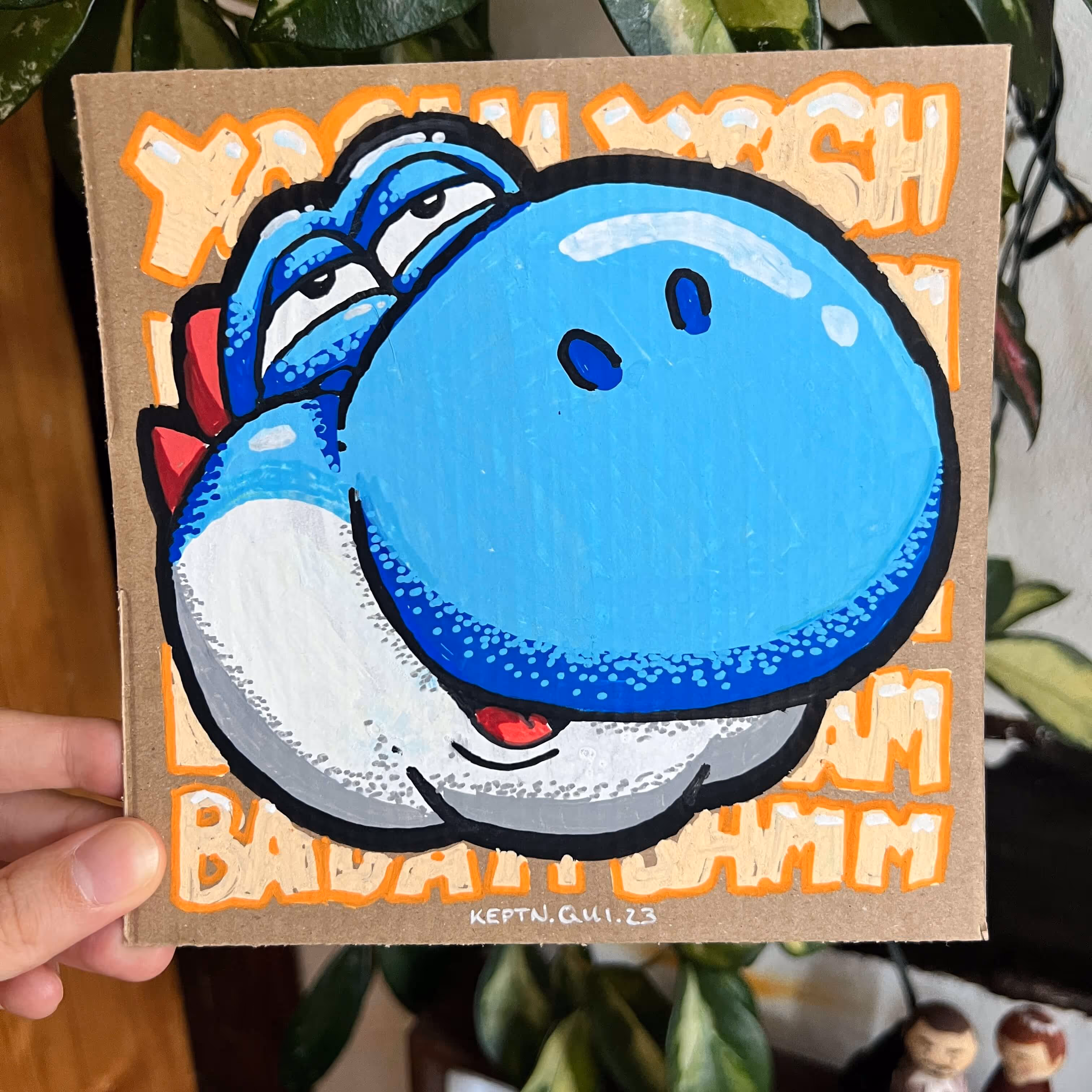 Chubby blauer Yoshi auf Pizzakarton M